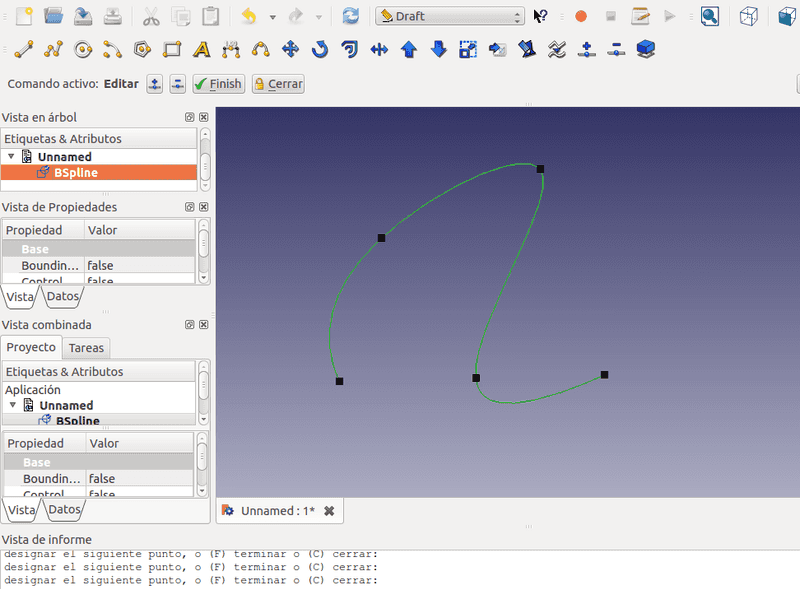 Empiezo yendo al escenario Draft y viendo que tenemos aquí, enseguida encuentro como hacer una B-Spline, pincho unos cuantos puntos y me sale esto: