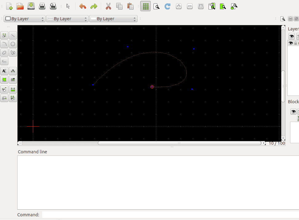 Paso entonces a otro programa, el LibreCAD, más enfocado a diseño 2D, por ejemplo planos o bocetos. Enseguida encuentro la opción Spline, que no dice mucho sobre cómo va a ser la curva. Hago unos cuantos puntos y me encuentro con lo siguiente: