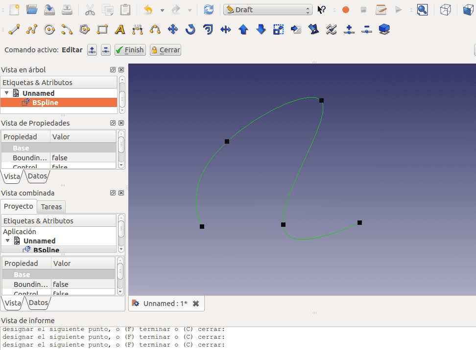 Empiezo yendo al escenario Draft y viendo que tenemos aquí, enseguida encuentro como hacer una B-Spline, pincho unos cuantos puntos y me sale esto: