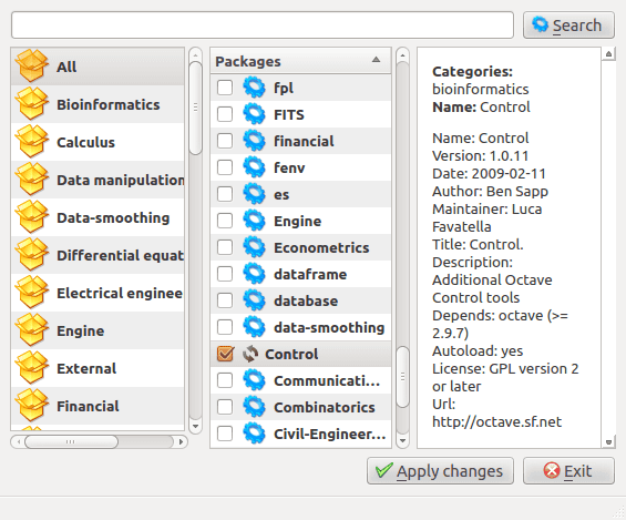 sudo qtoctaveUna vez abierto nos vamos al menú Configuración>Instalar paquetes de Octave y nos aparecerá un cuadro con los paquetes que podemos instalar, buscamos el de Control y lo instalamos.
