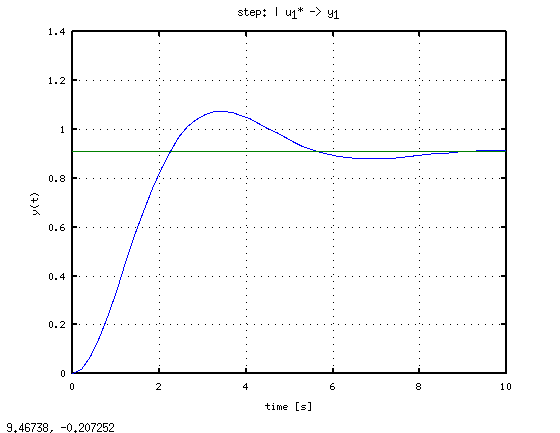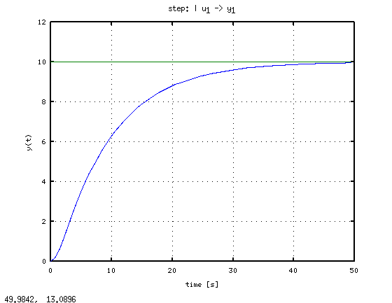 La línea azul nos muestra la evolución del sistema y la verde el valor al que tiende en el infinito. Como vemos el sistema llega a 10 en lugar de a 1 y es bastante lento, unos 50 segundos, así que vamos a mejorar todo esto con nuestro control P.