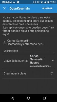 En primer lugar por lo tanto necesitaremos una clave privada propia, si ya tenemos una porque ya usábamos de antes OpenPGP, la exportaremos a un archivo y la subiremos al móvil de una forma segura (por cable por ejemplo, ¡No uséis internet para esto, es inseguro!), si es nuestra primera vez con OpenPGP podemos crear una nueva clave privada desde OpenKeychain.