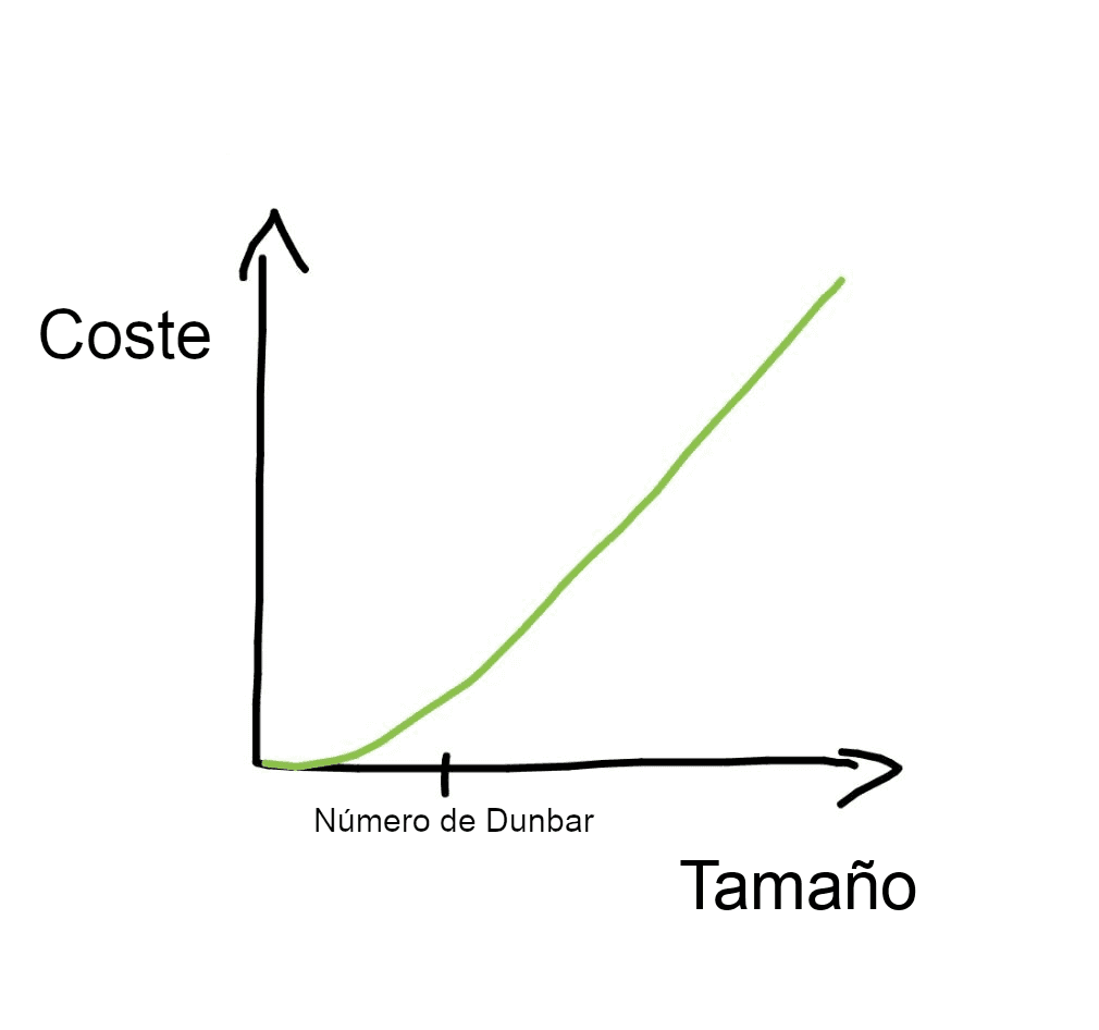 La relación entre tamaño y coste sería algo como en esta gráfica, partiría de cero pero se volvería una relación lineal al pasar el Número de Dunbar, el límite de relaciones que los humanos podemos mantener.